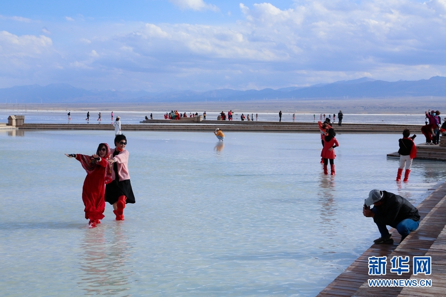 游客在茶卡鹽湖“天空之鏡”景區(qū)拍照留念。新華網(wǎng) 卡婭梅朵 攝