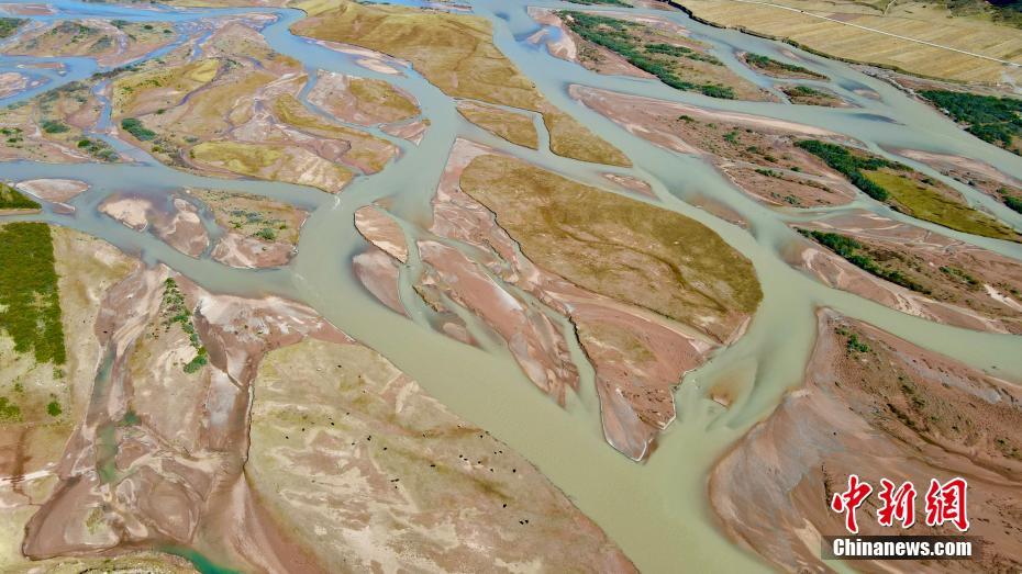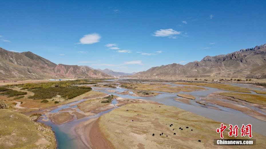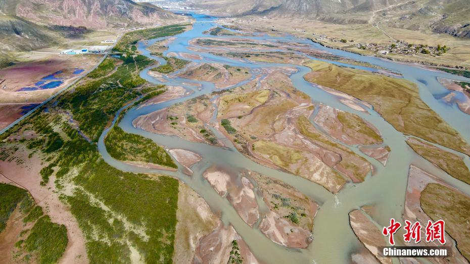 10月18日,航拍秋日的青海玉樹(shù)藏族自治州囊謙縣瀾滄江網(wǎng)狀水系,縱橫交錯(cuò)的水系,與周?chē)锛痉狐S的草原相襯,勾勒出了一幅絢麗畫(huà)卷。中新社記者 李江寧 攝