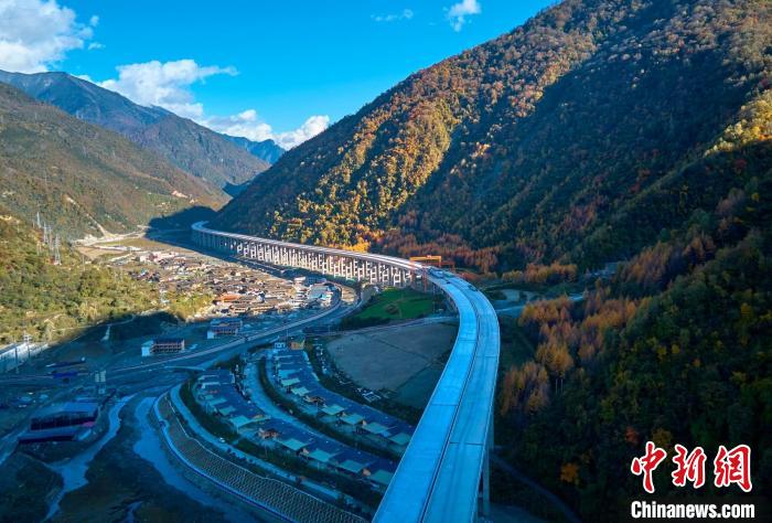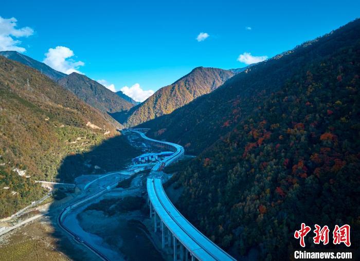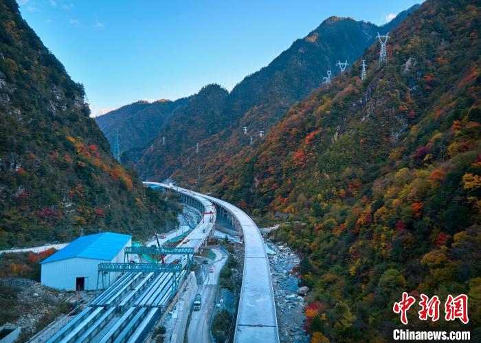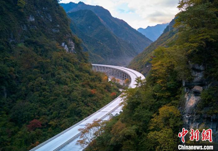 深秋時節(jié),四川省綿陽市平武縣紅葉滿山,層林盡染,仿佛打翻的調(diào)色盤,正在建設(shè)的九綿高速宛若一條玉帶穿行其中,想象通車后駕車行駛在這條高速上,如遨游在五彩斑斕的彩林畫廊中一般,讓人心曠神怡。