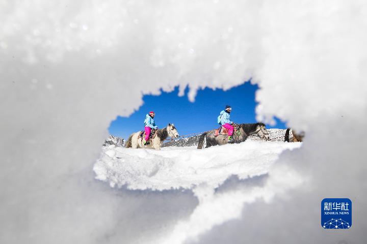 1月1日,登山者的馬隊在崗什卡雪峰的雪原上行進。新華社記者 張龍 攝