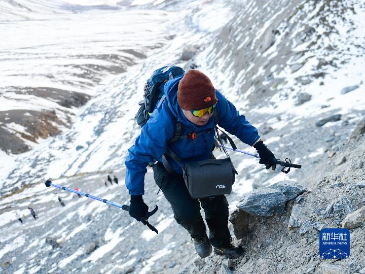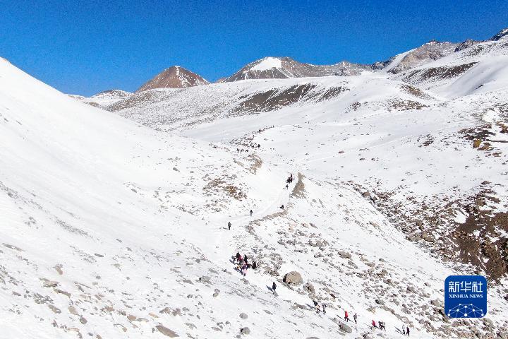 1月1日,登山愛好者攀登崗什卡雪峰(無人機照片)。新華社記者 張龍 攝