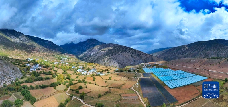 位于郎達村的得榮縣藥材種植示范基地(無人機全景照片)。新華社記者 劉坤 攝