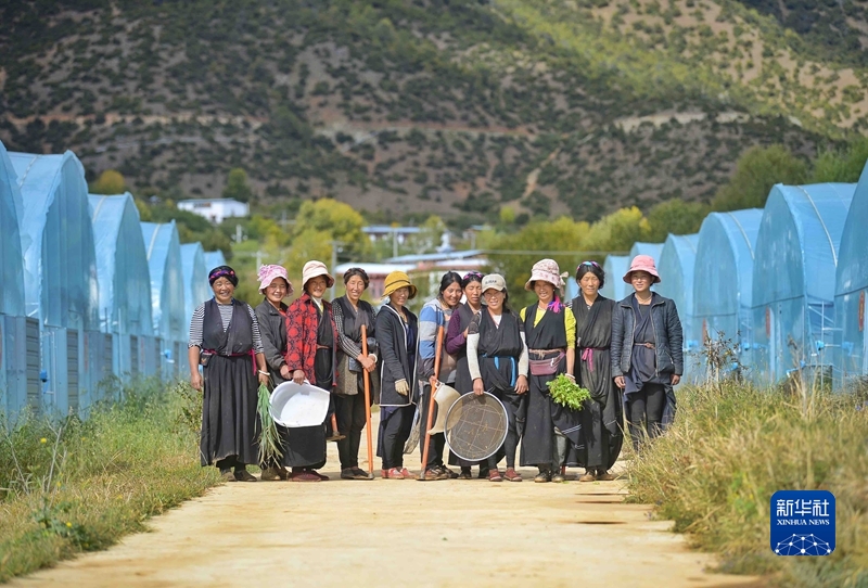 2021年10月22日,郎達村村民在得榮縣藥材種植示范基地內合影。 新華社記者 劉坤 攝