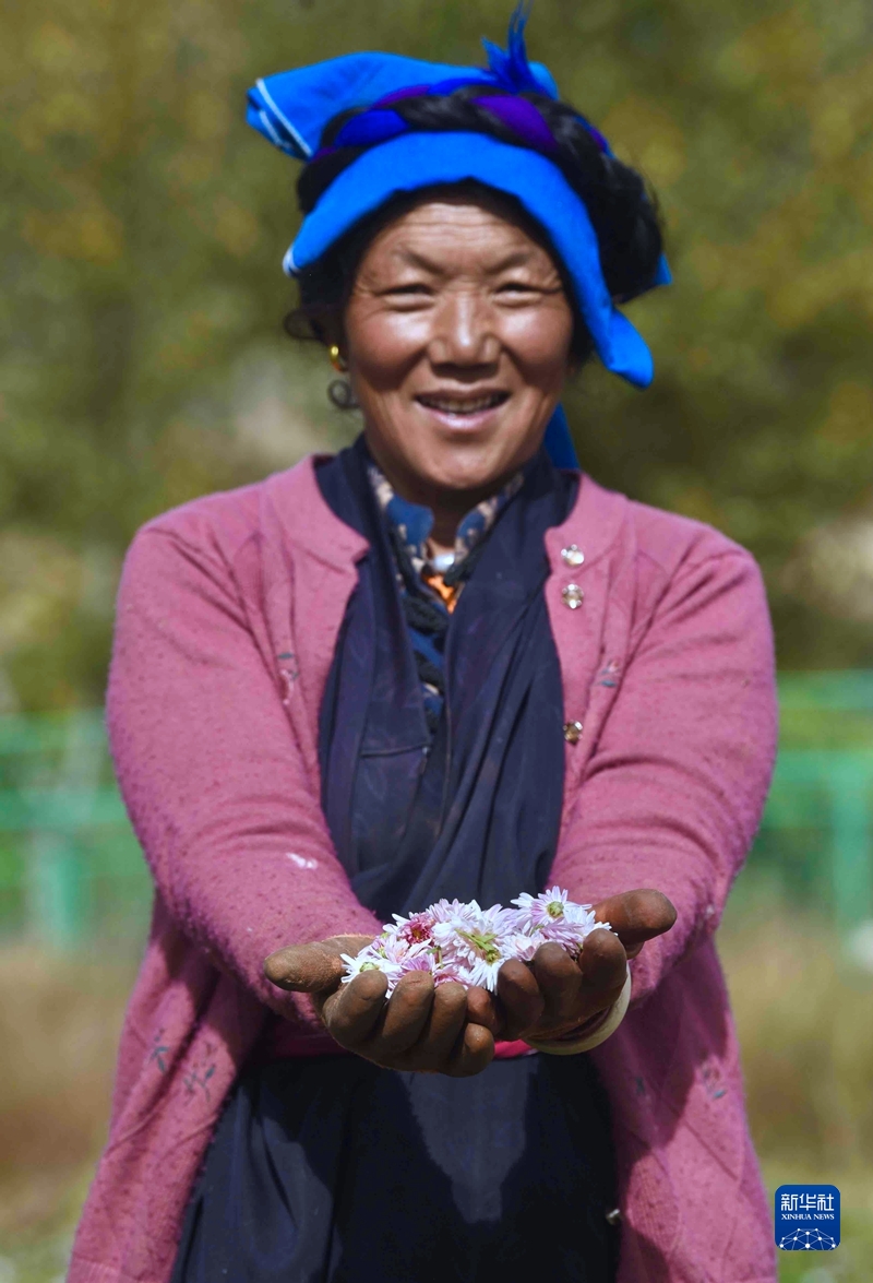 圖為一位郎達村村民在展示她收獲的藥菊。 新華社記者 劉坤 攝