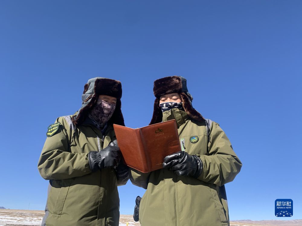 2021年12月3日,祁連山國家公園沙龍灘管護(hù)站巡護(hù)隊(duì)隊(duì)長楊有財(左)在巡護(hù)監(jiān)測記錄手冊上記錄。新華社 李琳海 攝