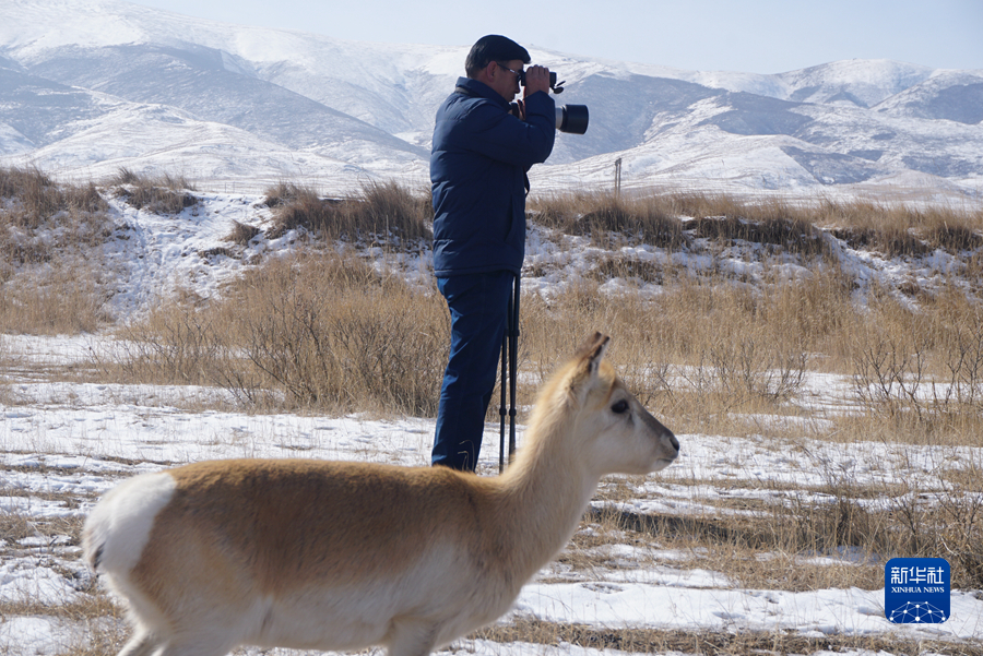 2月11日,吳永林正在和普氏原羚“東東”一起巡查。新華社記者 周盛盛 攝