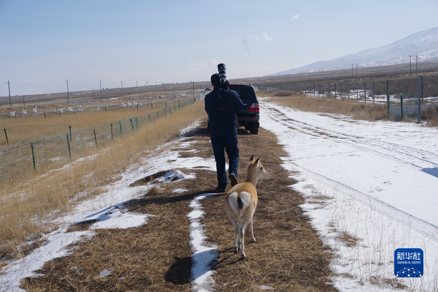 2月11日,吳永林正在和普氏原羚“東東”一起在保護站內巡查。新華社記者 周盛盛 攝