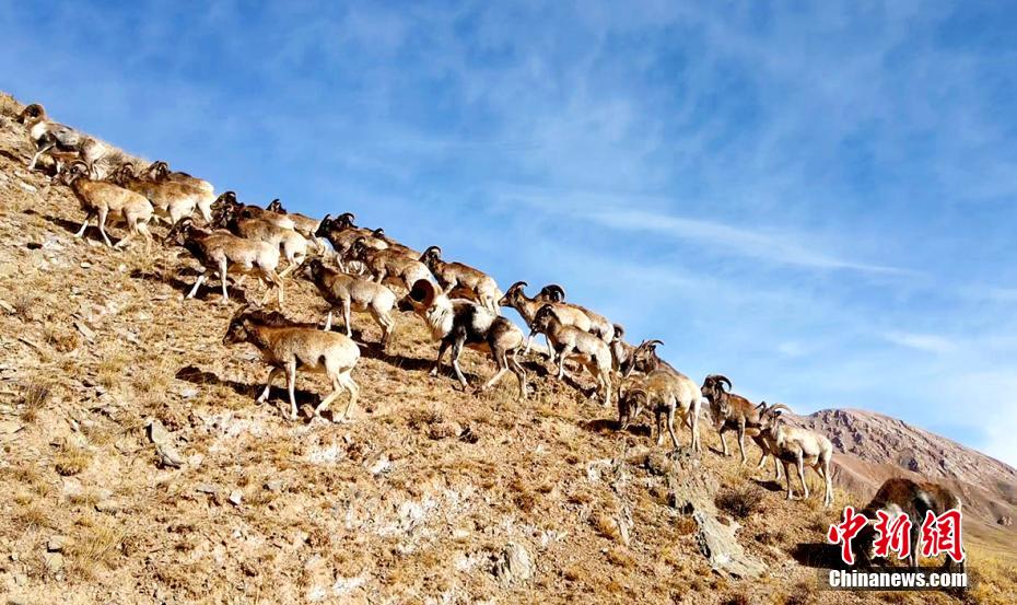 近日,攝影愛好者在地處柴達(dá)木盆地的青海省海西州都蘭縣香加鄉(xiāng)山區(qū)拍到成群盤羊。[詳細(xì)]