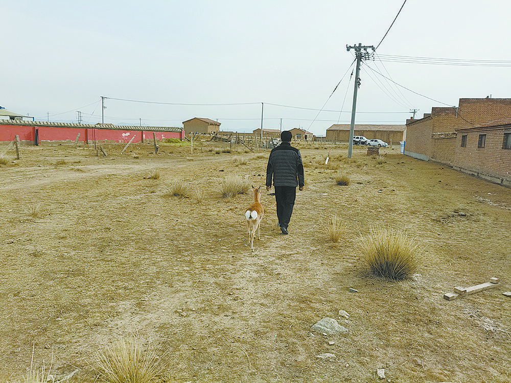 半個(gè)多月來,盡管我們已經(jīng)習(xí)慣了目睹一只普氏原羚與牧人形影不離的場景,但每當(dāng)凝望那片草色枯黃的原野,牧人周增本無論走向何處,一只小原羚總是在6、7米外不緊不慢地跟隨著他,心里便會(huì)涌起一種無以名狀的感動(dòng),不禁令人熱淚盈眶。