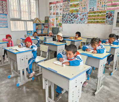2017年,隨著易地扶貧搬遷政策的落實(shí),越來越多村民選擇搬到山腳開始新的生活。學(xué)校里的孩子們由32名減少到9名?!?個(gè)孩子有7個(gè)是留守兒童,最大的8歲,最小的3歲。”完么仁增把黑板分成兩塊,左邊是一年級(jí),右邊是學(xué)前班,“安排了語文、數(shù)學(xué)、美術(shù)、道德與法治4門課,采用復(fù)式班的教學(xué)模式”。