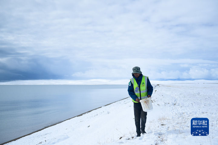 2021年10月,三江源國(guó)家公園黃河源園區(qū)生態(tài)管護(hù)員俄措在扎陵湖邊撿拾垃圾。新華社記者 張龍 攝