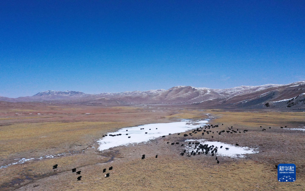 4月20日,在青海省玉樹(shù)藏族自治州曲麻萊縣,牦牛在草原上覓食(無(wú)人機(jī)照片)。新華社記者 柳澤興 攝