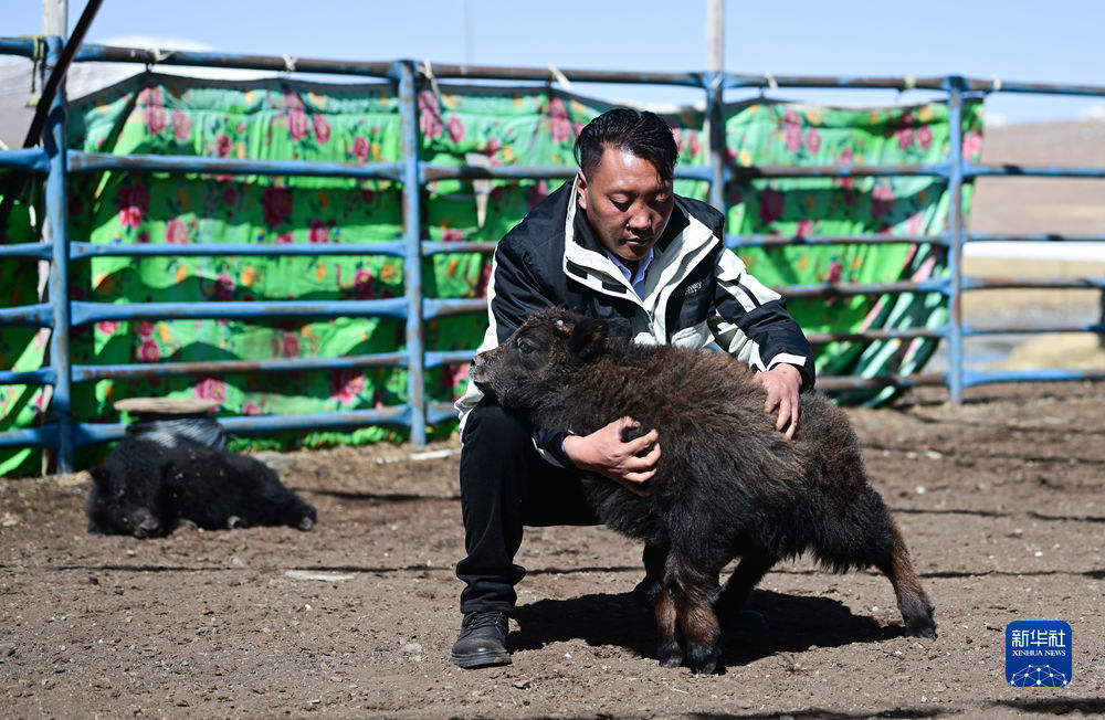 4月20日,在青海省玉樹(shù)藏族自治州曲麻萊縣,牧民在查看牛犢生長(zhǎng)情況。新華社記者 張龍 攝