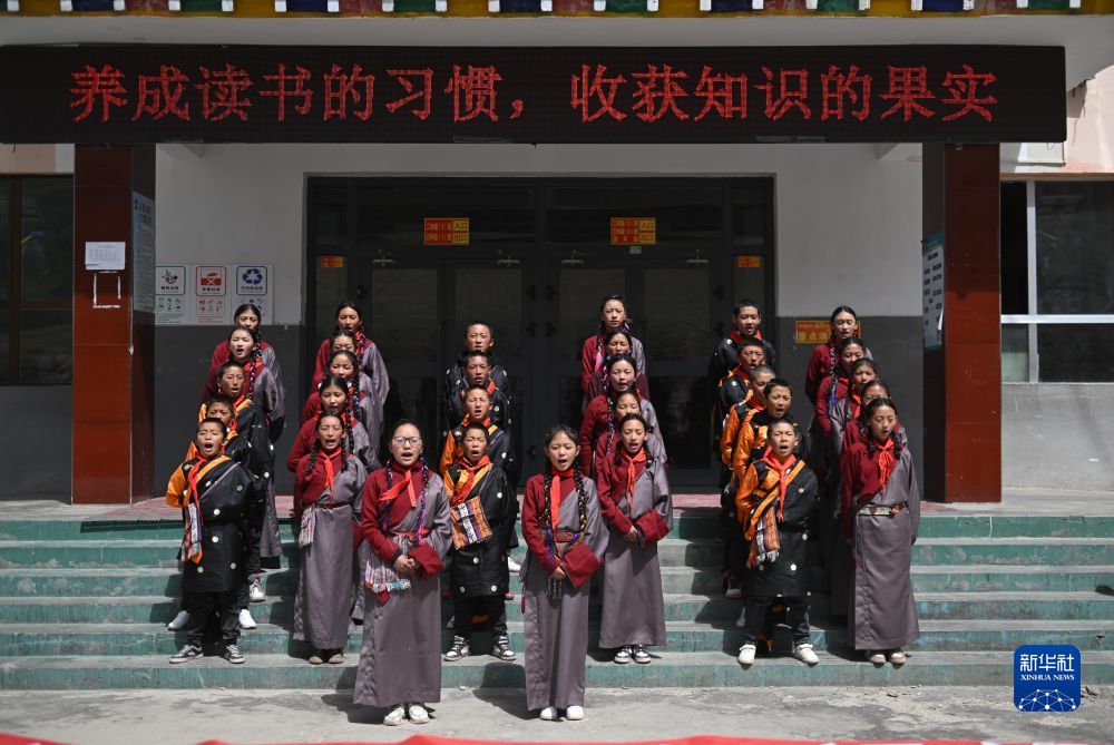 4月22日,青海省玉樹藏族自治州曲麻萊縣巴干鄉(xiāng)寄宿制小學(xué)的學(xué)生在學(xué)校組織的“世界讀書日”活動中誦讀經(jīng)典。新華社記者 張龍 攝