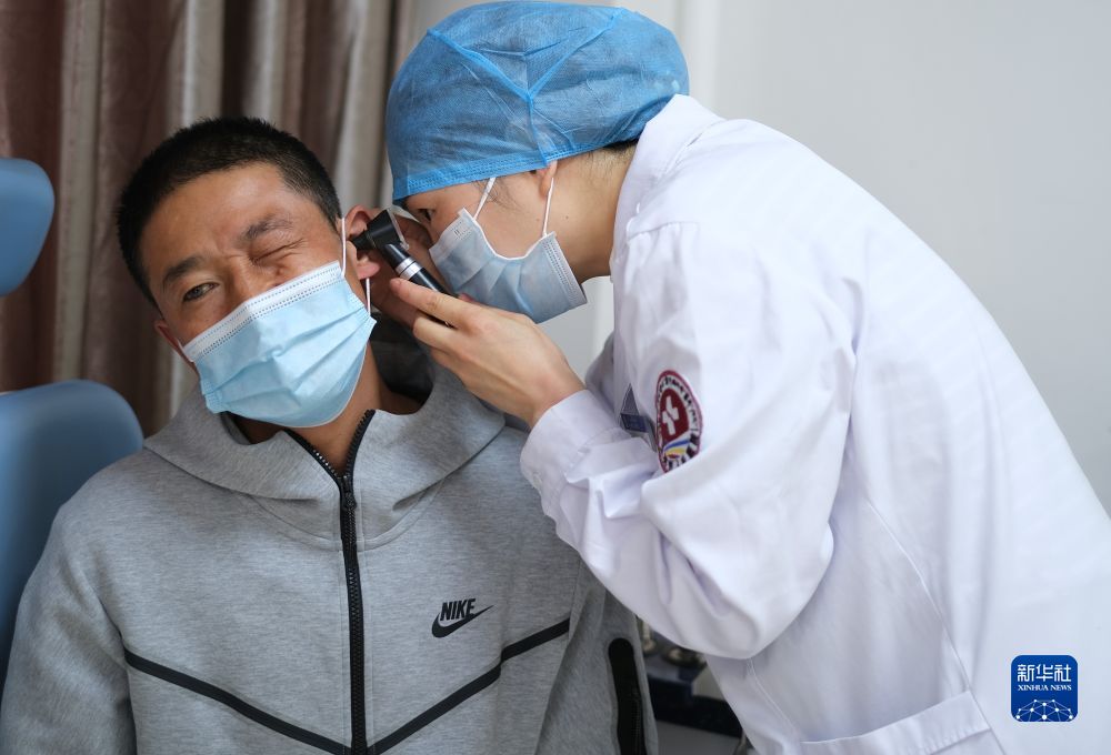 青海省人民醫(yī)院醫(yī)生、青南支醫(yī)隊(duì)員王菲在玉樹(shù)藏族自治州人民醫(yī)院給患者進(jìn)行檢查。新華社記者 韓方方 攝