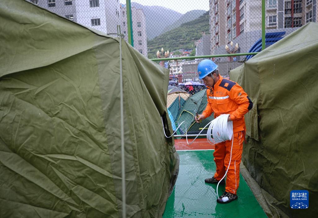 6月10日,在馬爾康市州醫(yī)院背后廣場安置點內,國家電網(wǎng)工作人員在鋪設電線。新華社記者 劉坤 攝