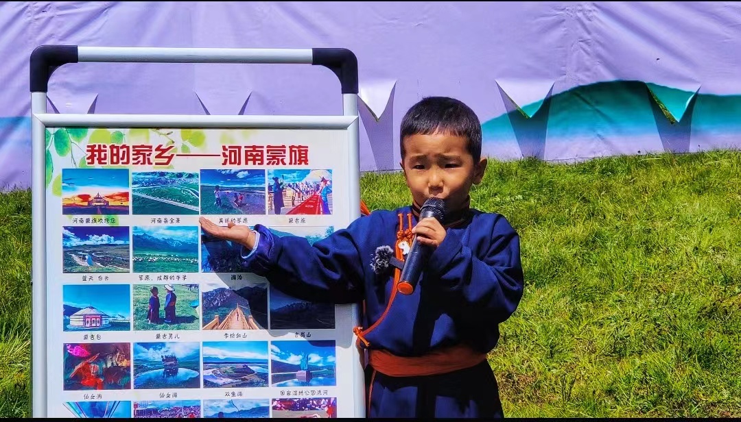 “我的家鄉(xiāng)在中國西部,這里有一片非常美麗的大草原,大家都喜歡叫她‘河南蒙旗’,這里有藍天、白云、草原、牛羊、湖泊、河流……”來自青海省黃南藏族自治州河南蒙古族自治縣中心幼兒園五歲半的觀卻東珠作為“講解員”,正聲情并茂的向老師、同學(xué)以及家長介紹自己的家鄉(xiāng)。