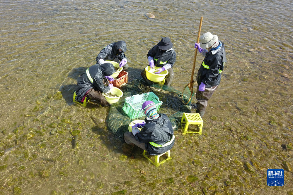6月29日,在泉吉河河道中,工作人員捕撈親魚(無人機(jī)照片)。新華社記者 范培珅 攝