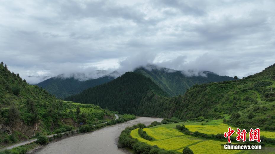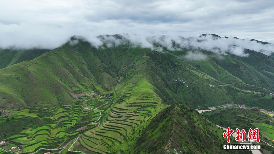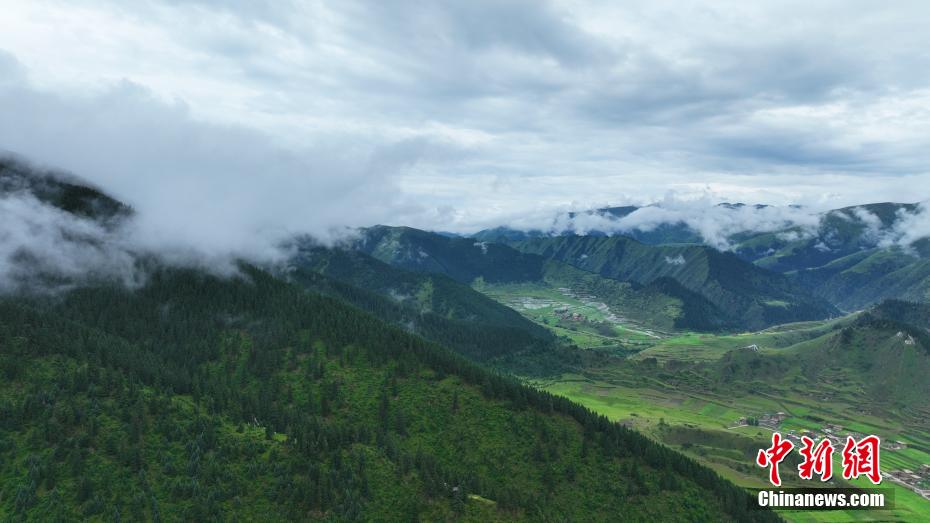 7月11日,一場降雨過后,云霧如潔白的哈達(dá)飄落在青海省果洛藏族自治州班瑪縣瑪可河國家森林公園山頭,與樹木、河流、梯田相互映襯,自然風(fēng)景美如畫。