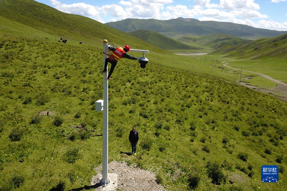 7月22日,在甘德縣生態(tài)畜牧業(yè)聯(lián)合社牦牛養(yǎng)殖基地,技術人員維護視頻監(jiān)控設備(無人機照片)。新華社記者 范培珅 攝