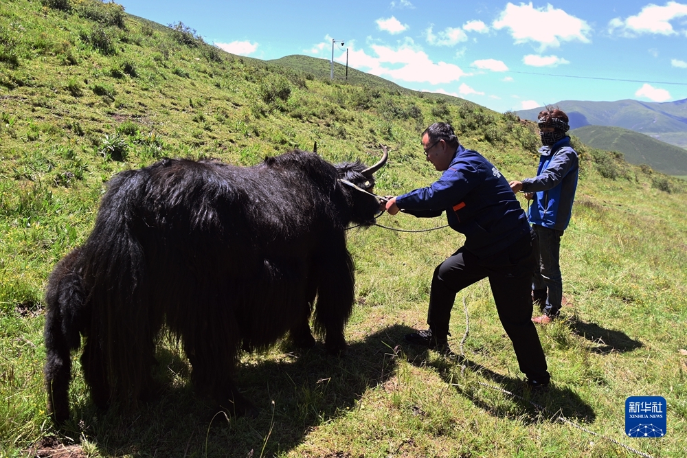 7月22日,在甘德縣生態(tài)畜牧業(yè)聯(lián)合社牦牛養(yǎng)殖基地,技術人員給牦牛佩戴智能項圈。新華社記者 范培珅 攝