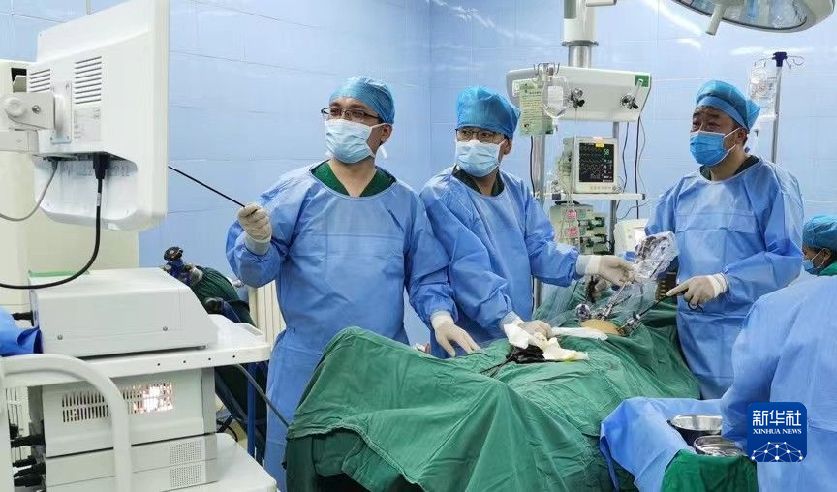 2021年,天津援青醫(yī)生李永元(左一)在黃南州人民醫(yī)院指導(dǎo)當(dāng)?shù)蒯t(yī)生開展腹腔鏡手術(shù)。(圖片由天津援青指揮部提供)