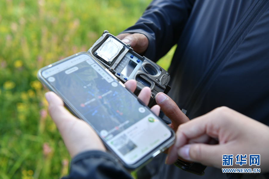 孔玥嶠和生態(tài)管護(hù)員正在查看野外布設(shè)的紅外相機(jī)的相關(guān)數(shù)據(jù)。新華網(wǎng) 卡婭梅朵 攝