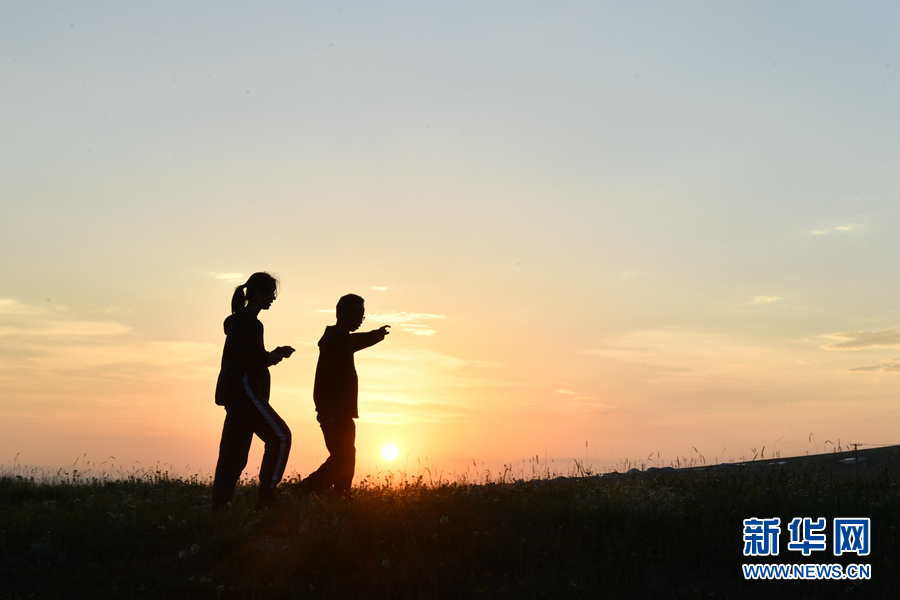伴著夕陽(yáng),孔玥嶠正在和生態(tài)管護(hù)員交流工作。新華網(wǎng) 卡婭梅朵 攝