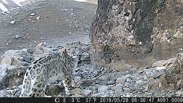 “我時(shí)常覺得,與其說是我們觀察雪豹,不如說是雪豹在觀察我們,它觀察我們,比我們觀察它要容易得多?!睋?jù)王大軍講述,有一次,團(tuán)隊(duì)追蹤到一只雪豹的身影停留在山間,但遠(yuǎn)遠(yuǎn)望去,只有一條尾巴露在外面。通過攝影設(shè)備拉近畫面,才發(fā)現(xiàn)原來(lái)那只雪豹的雙眼也正在透過巖石的縫隙,觀察著他們。