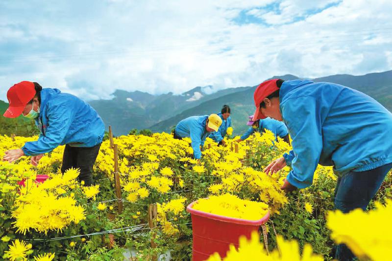 進入8月,在四川省涼山州木里藏族自治縣喬瓦鎮(zhèn)簸箕籮村木里縣農(nóng)業(yè)產(chǎn)業(yè)示范園里,150畝的金絲皇菊像一塊巨大的金色地毯鋪在田野上?!艾F(xiàn)在正是金絲皇菊的采收時節(jié),村民們的腰包又要鼓起來了!”木里縣委書記高峰說。