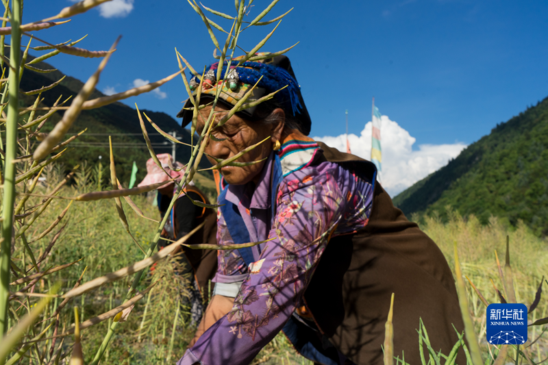 在四川省阿壩藏族羌族自治州金川縣二普魯村,阿木初和村民在收割油菜(8月24日攝)。新華社記者 唐文豪 攝