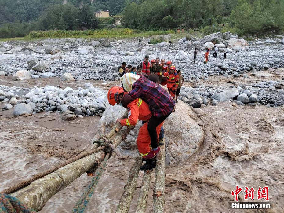 森林消防員抬著受傷群眾過(guò)河。四川森林消防供圖 攝