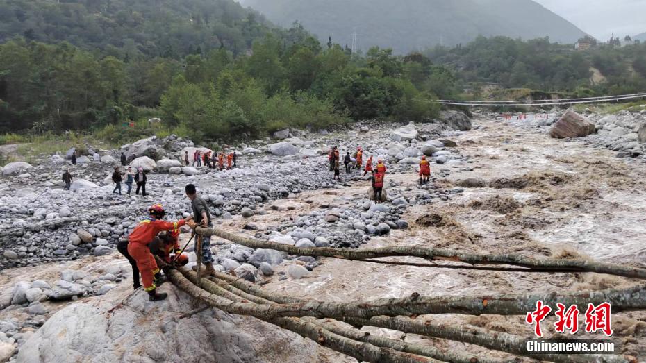 群眾和森林消防員正在搭建簡(jiǎn)易過(guò)河木橋。四川森林消防供圖 攝