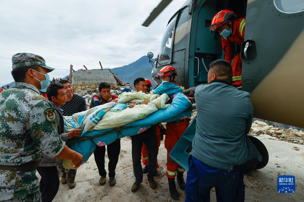 9月6日,救援人員抬著一名從瀘定縣得妥鎮(zhèn)灣東村疏散出來的受傷村民,準備通過直升機將其運出。新華社記者 沈伯韓 攝