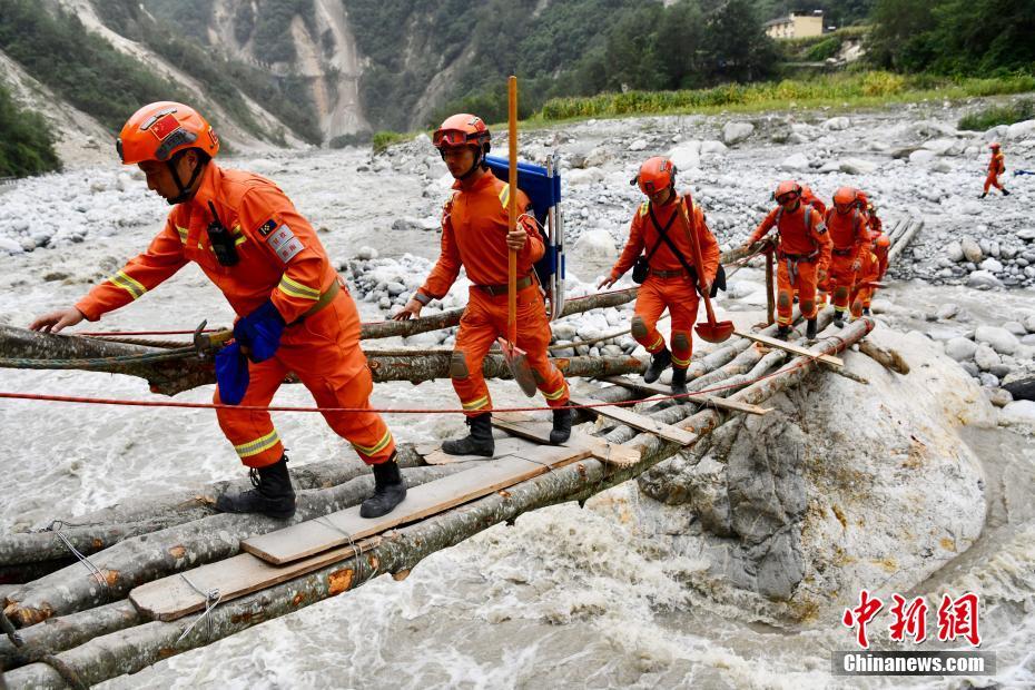 9月6日,四川甘孜州瀘定縣磨西鎮(zhèn),甘孜州森林消防支隊(duì)康定中隊(duì)隊(duì)員在木橋旁護(hù)送村民。 中新社記者 張浪 攝