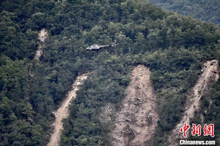 救援直升機(jī)轉(zhuǎn)運(yùn)傷員,山體垮塌痕跡赫然可見(jiàn)。張浪 攝