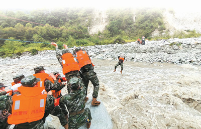 一幕幕救援場景,令億萬網(wǎng)友動容:面對湍急的河水,特警隊(duì)員用身體和繩索搭起“生命橋”,全力轉(zhuǎn)移被困群眾;面對橋梁垮塌,森林消防員自制擔(dān)架、木橋,抬傷員過河……