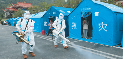 9月6日,武警四川總隊(duì)醫(yī)院醫(yī)護(hù)人員在瀘定縣磨西鎮(zhèn)臨時(shí)安置點(diǎn)開展消殺工作。李華時(shí) 攝(人民圖片)