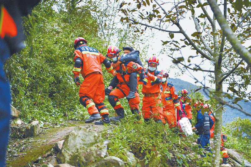 救援隊員協(xié)助紫雅場村最后一批村民下山,他們隨后將通過水路轉(zhuǎn)移至設(shè)在得妥鎮(zhèn)場鎮(zhèn)的受災(zāi)群眾安置點(diǎn)。 四川日報全媒體記者 楊樹 攝