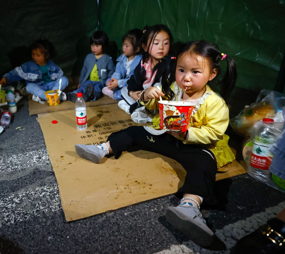 9月5日晚,在磨西鎮(zhèn)的受災(zāi)群眾臨時安置點,幾個家庭的孩子們在一個帳篷里吃飯、休息。