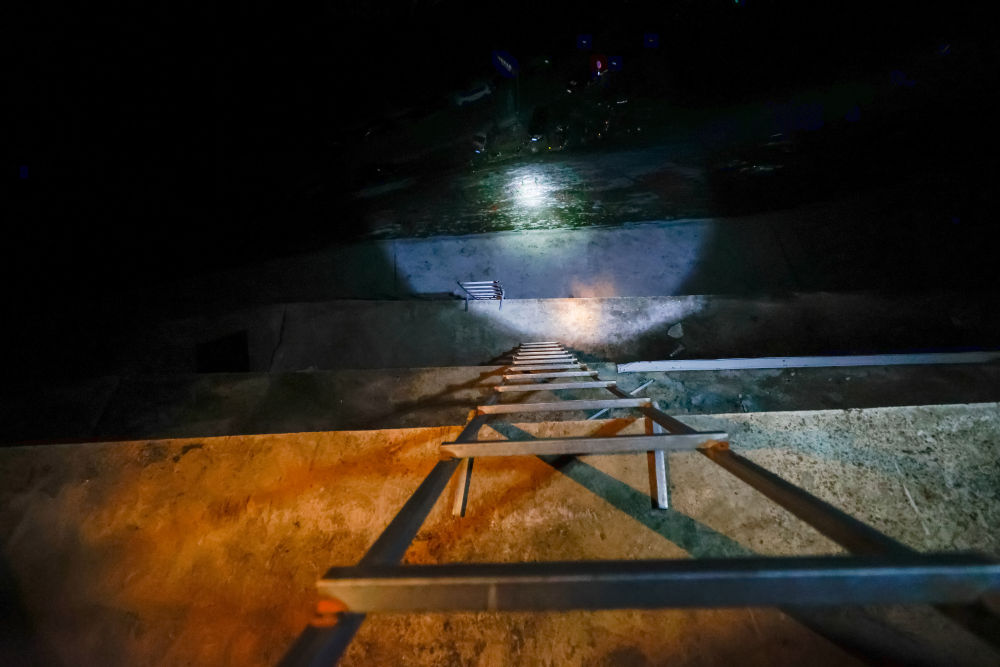 本以為沿著這條公路就可以走到得妥,轉(zhuǎn)過幾道彎,前面道路中斷完全無法通行,李祥帶我們到了真正可以下山的地方。這是一片分為好幾層的幾乎垂直的水泥邊坡,即便是應(yīng)急電筒的強光,也照不亮它的底。每層邊坡之間有鋼梯連接,我們要順著鋼梯爬下去,“山下會有車來接我們”,李祥淡定地說。