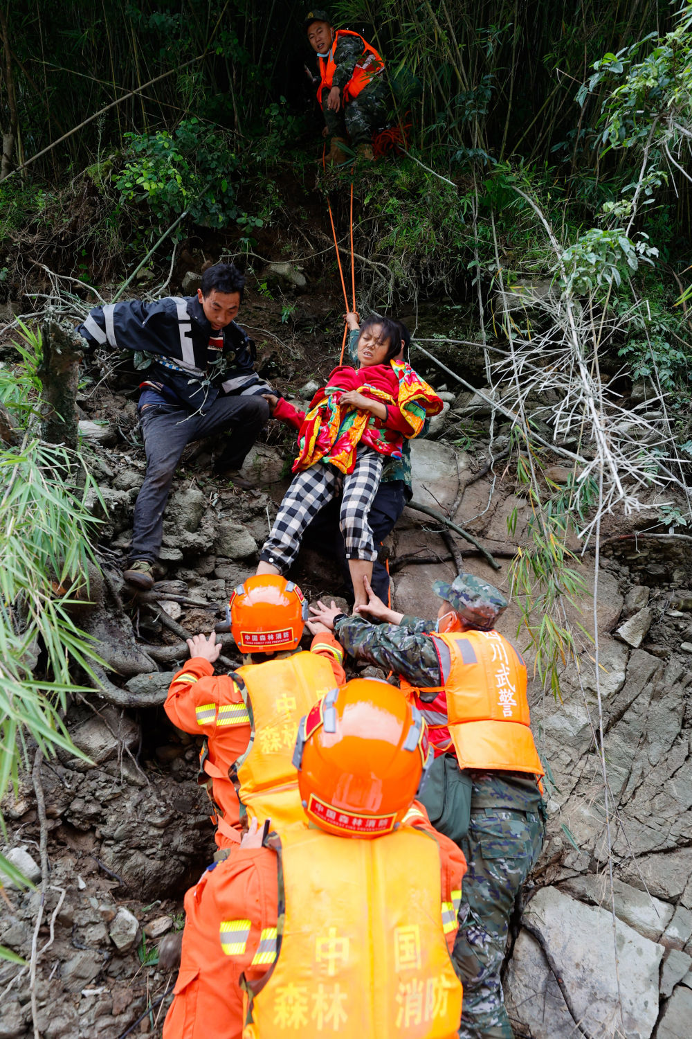 下直升機后,我馬上拍攝了運送村民傷員的照片與視頻,又跟隨資陽消防隊隊員一起徒步兩個小時趕到一個老人的家中進行救援和采訪拍攝,這里位于大山深處,道路基本全部坍塌,山體大規(guī)?;?,消防隊員帶我爬過數(shù)個陡峭滑坡路段,我們就像走在一個直角三角形的斜邊上,每走一步都會帶起一堆砂石滾落到山澗里。我當時顧不得害怕,一心想著趕到目的地把照片拍好……現(xiàn)在敲著這行字時回想起當時的情況,我的手心還是冷汗直流。