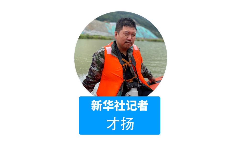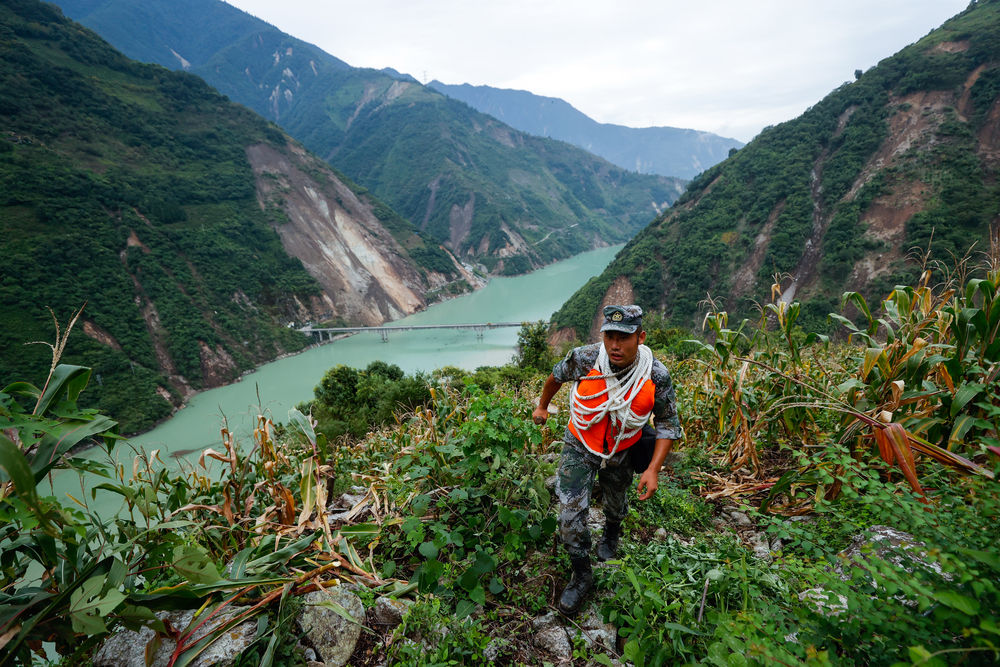 大渡河水奔涌流去,但穿梭于各個村莊間的救援人員毫無畏懼。我們隨救援人員一起坐上沖鋒舟,兩岸的山上不斷有滾石滑落。