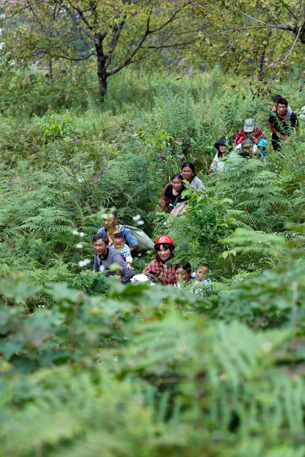 熟悉地形的村民在前帶路。其實毫無“路”可言,我和救援人員只能沿著依稀可辨的足跡向上攀爬。山高陡峻,時不時會遇到山體傾斜角度大于60度的路段,只能手腳并用才能上去。為了減輕負重,我把巧克力這樣的補給都放在了山下,只帶了一瓶水在身上。很快,滿頭大汗,汗水流入眼睛刺得生疼。抬頭望著遙遠的需要翻越的山頭,對體力和耐性都是巨大考驗。一些救援人員因為工作需要,還背著很重的繩子,辛苦程度可見一斑。