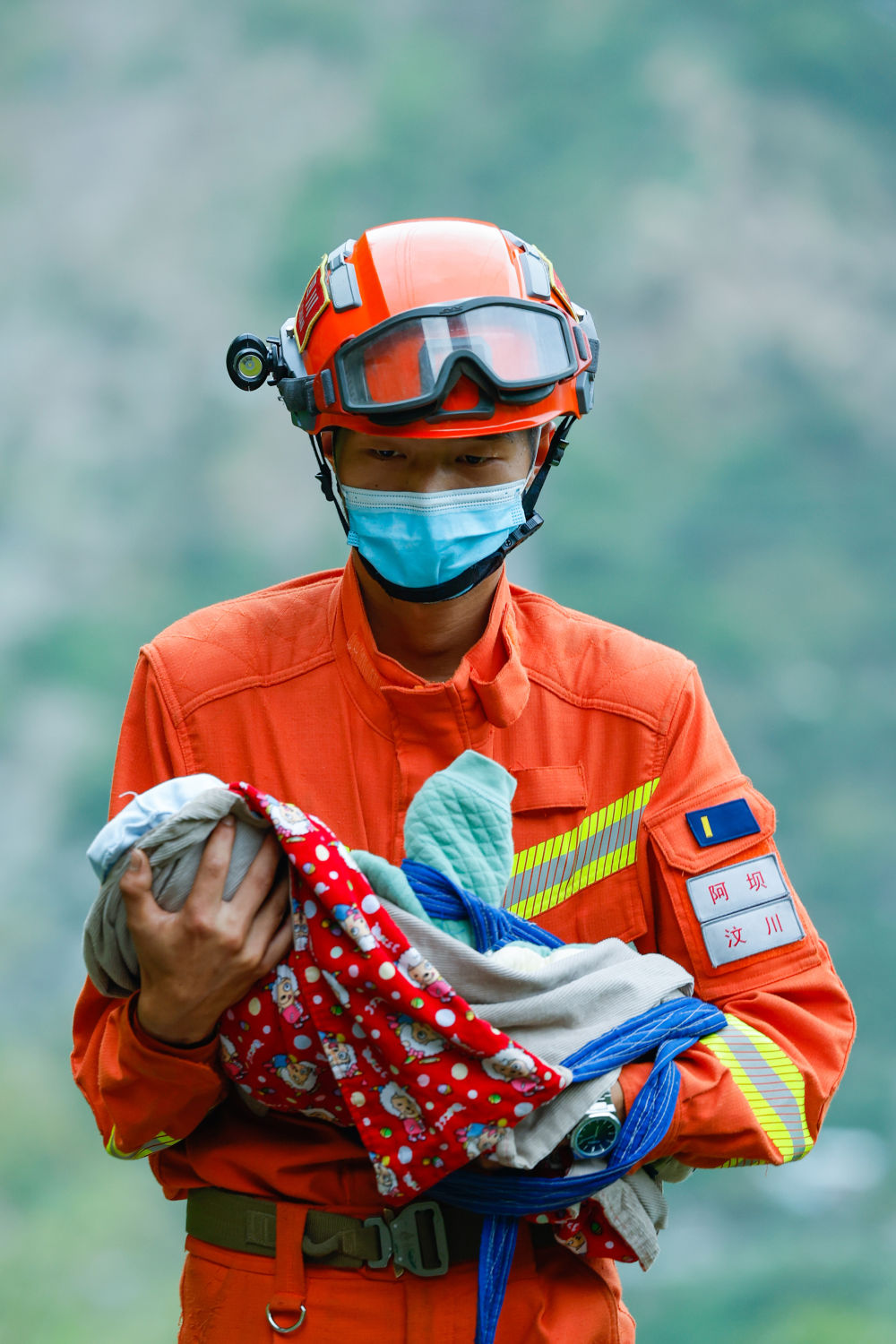 我一路小跑到消防員前面一段距離,拿起帶著長焦鏡頭的相機,蹲下,拍攝,再向前跑一段,再蹲下,再拍攝。經(jīng)歷了一天差不多10個小時的徒步、拍攝,此時我的體力確實有些跟不上,為了保證能把這個場景拍好,只能多拍一些,不留遺憾。消防員沿著土路折了幾道彎才走到聯(lián)合村隧道口的大路,把嬰兒交給值守在那里的瀘定縣人民醫(yī)院的醫(yī)護人員。此時我才有時間和他簡單聊了聊。他叫張自立,來自阿壩森林消防支隊汶川大隊,2個月大的嬰兒來自重災(zāi)區(qū)灣東村。經(jīng)過包括新華社、人民日報、央視等媒體對這張照片的傳播,他第二天就成了大家口中的“汶川哥哥”。