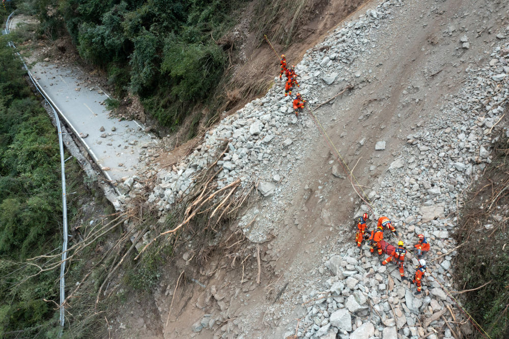 經(jīng)過3個多小時的攀爬,終于抵達紅花崗。村民們的房子倒塌嚴重,有的房頂直接砸在了地上。稍事休息,我和救援人員沿著公路向山下的灣東村繼續(xù)行進。這條公路被塌方損毀較為嚴重,石頭、泥土、被帶下來的粗壯樹木橫亙在道路中央,有時,甚至整個路段都被掩埋、下沉。
