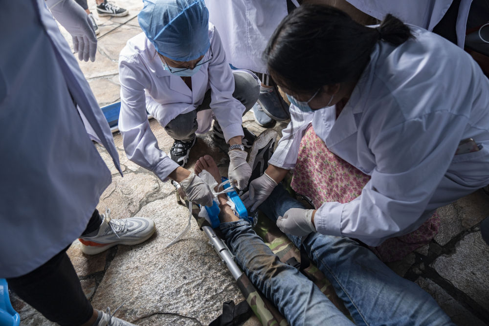 9月6日,在磨西鎮(zhèn)海螺溝廣場受災(zāi)群眾臨時安置點,醫(yī)護人員為傷員包扎。