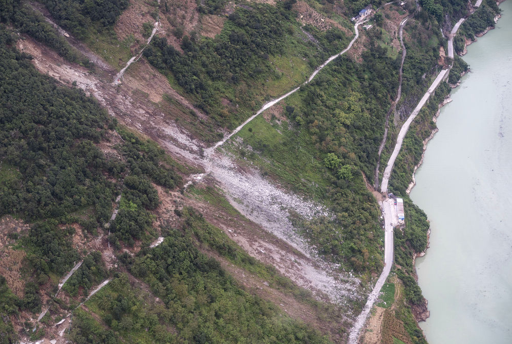 這是9月7日拍攝的幸福村二組附近的照片,可看到山體多處滑坡(無人機照片)。