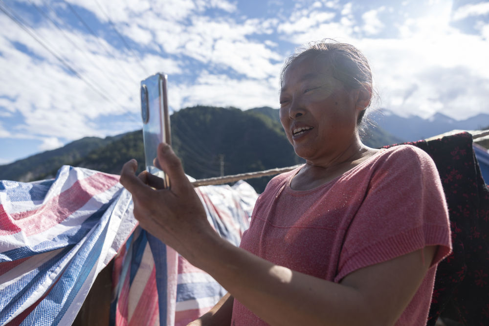 9月10日,在幸福村,技術(shù)人員安裝衛(wèi)星便攜站后,村民在與家人用手機進行視頻通話。