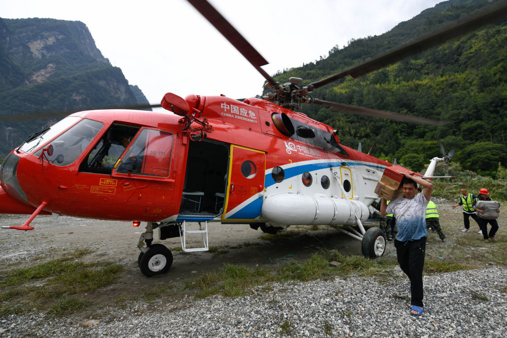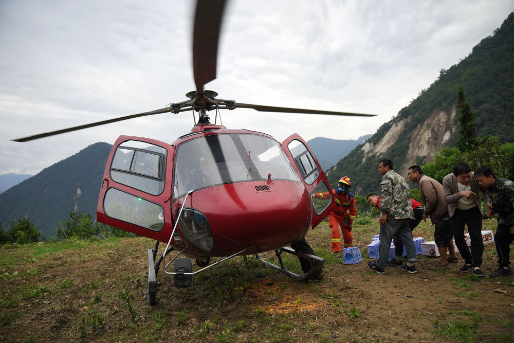 7日一早,我和同事從水路轉(zhuǎn)空路,搭乘滿載食品和帳篷等救援物資的直升機挺進草科鄉(xiāng),彼時各類救援物資和通訊設(shè)備正陸續(xù)開始送往草科鄉(xiāng)及深山里的幾個村子。